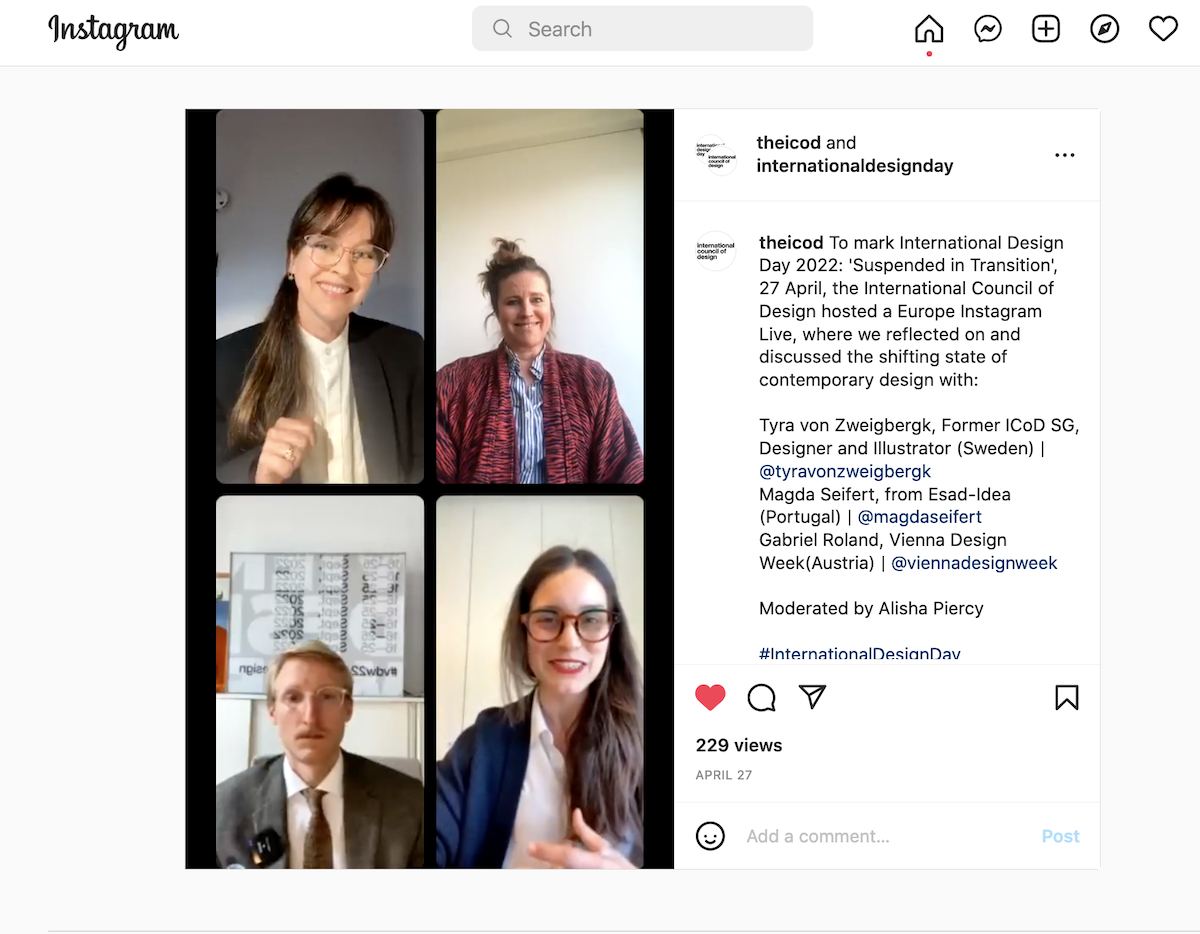 The third IG Live moving West was the Europe Live, with representatives from two design weeks and a former ICoD Board Member, the panel included Tyra von Zweigbergk, Former ICoD Secretary General, (Sweden), Magda Seifert, representing the Porto Design Biennale (Portugal) and Gabriel Roland, representing Vienna Design Week (Austria). The session was moderated by ICoD Communications Officer, Alisha Piercy. See the video on our Instagram by clicking on the image below.